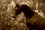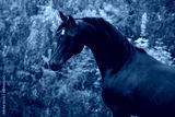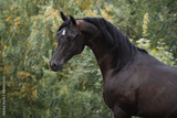 Portrait of a beautiful black arabian horse on natural green summer background, head closeup