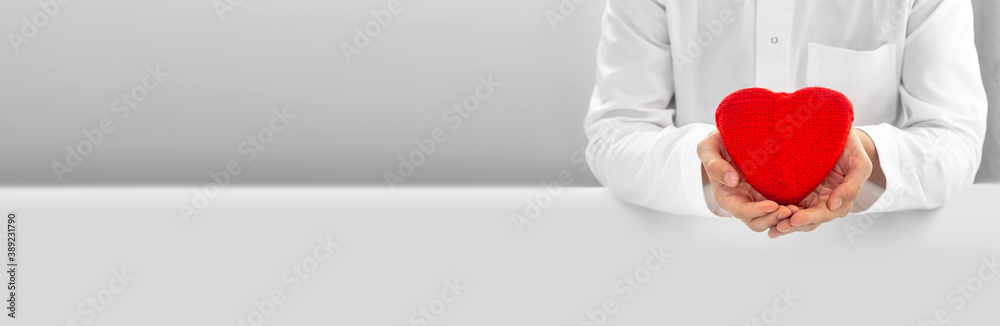 Doctor's hands with red handmade heart. Concept care for a human heart in medical, web banner for cardiology