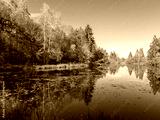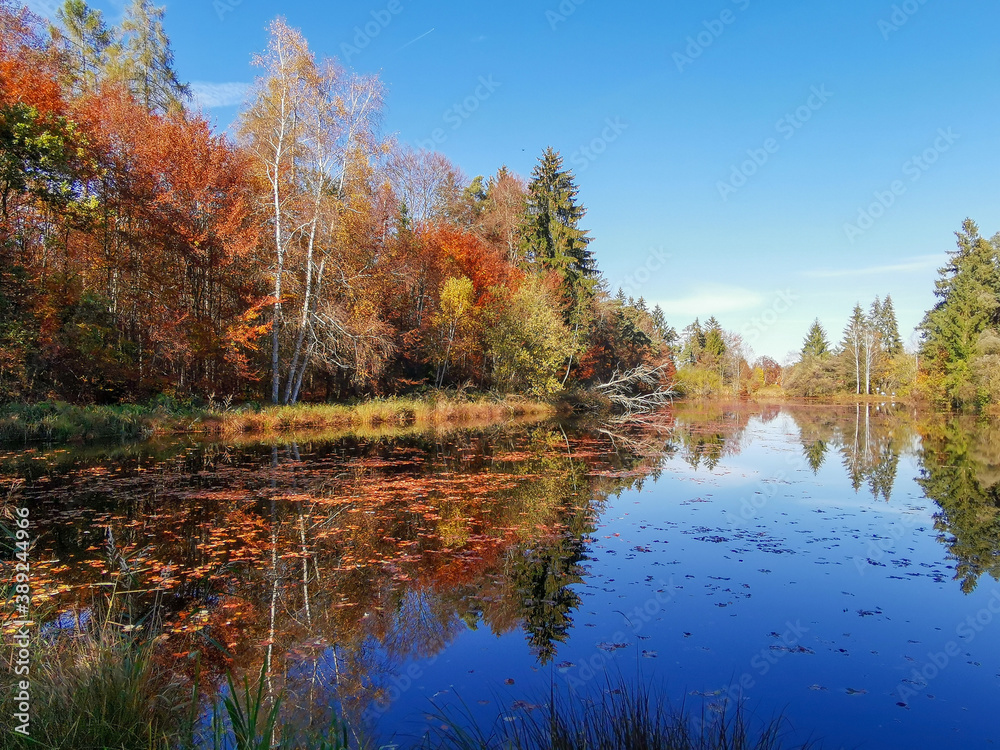Trees with golden autumn colors behind a lake with reflections against a blue sky
