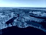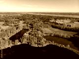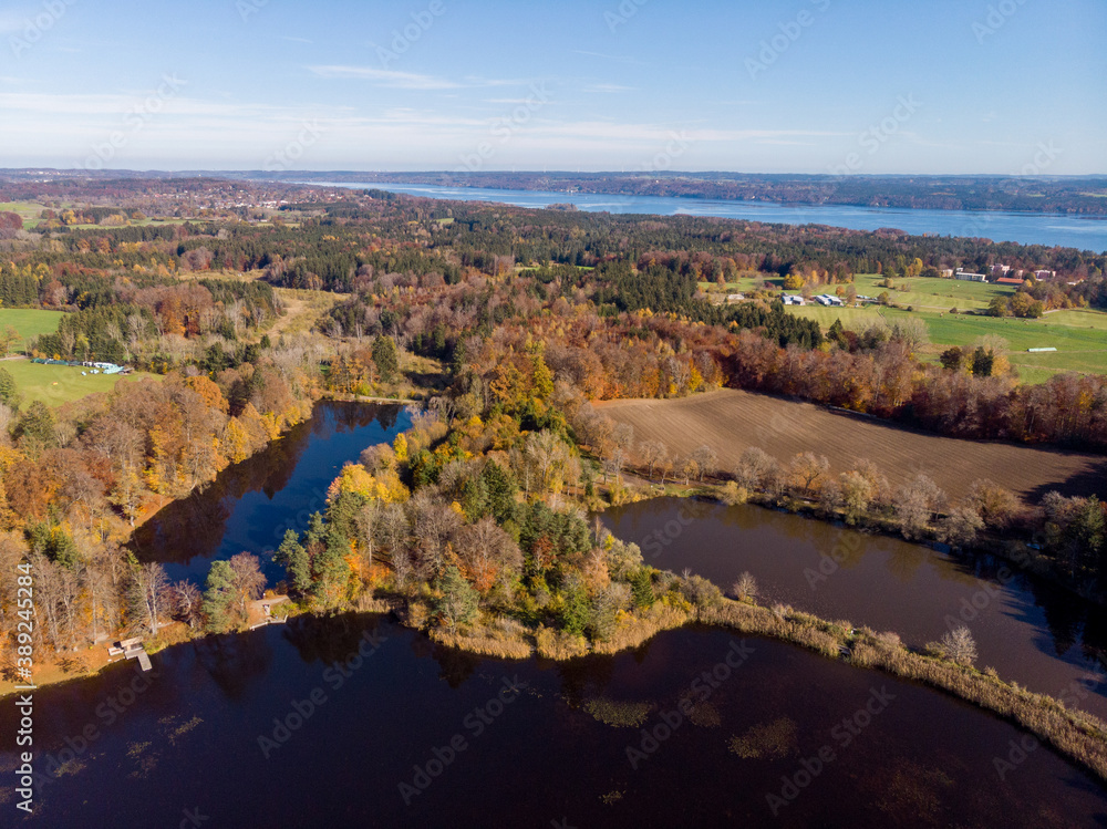Aerial view of 4 lakes in autumn against a blue sky with clouds