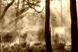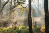 Poranna mgła unosząca się nad rzeką płynącą przez las.