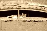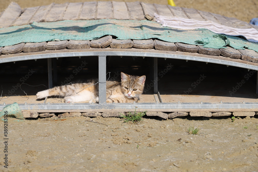 Striped kitten lies in the sand under the bridge