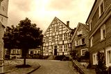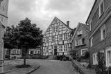 Outdoor street view of small town with traditional German wooden townhouses around Neviges Church in Velbert, Germany.
