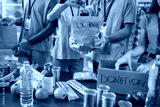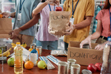 Cropped shot of male and female volunteers holding paper bag with food while packing donation for needy people, Young team working in charitable foundation