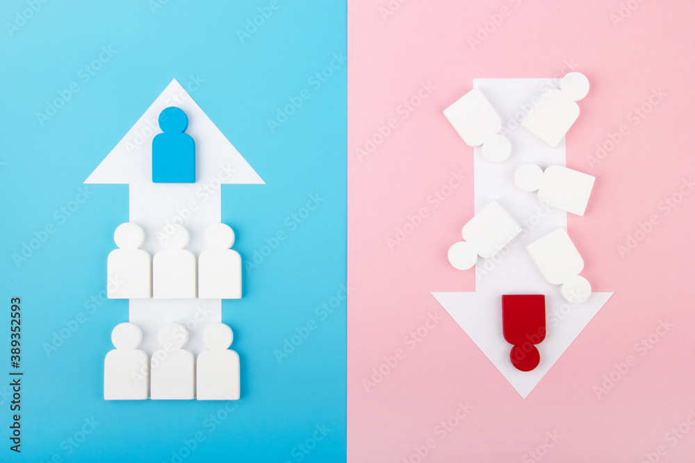 Wooden figure standing on the white arrow for show influence and empowerment. Concept of business leadership for leader team, successful competition winner and Leader with influence