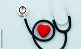 Stethoscope with red heart isolated on blue background, top view. Healthcare and medicine concept.