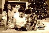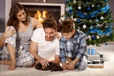 Happy young family caressing sleeping dachshund puppy at christmas morning.