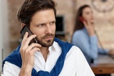 Closeup portrait of businessman talking on mobilephone, looking away.