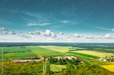 Aerial Bird's-eye View Of Building Of Cowshed Cow Farm Located In Countryside In Sunny Summer Day. Animal Husbandry Area
