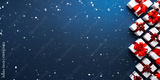 Merry Christmas and Happy Holidays greeting card, frame, banner. New Year. Noel. Christmas ornaments and gifts on blue background top view. Winter xmas holiday theme. Flat lay