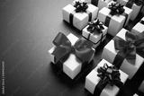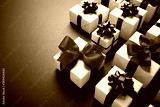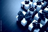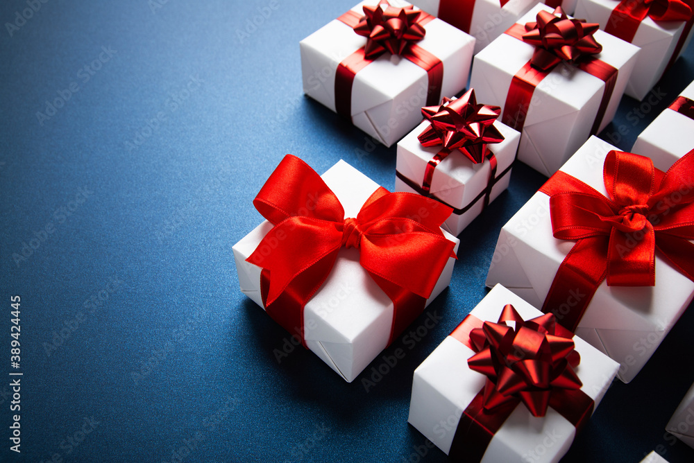 Merry Christmas and Happy Holidays greeting card, frame, banner. New Year. Noel. Christmas gifts on blue background. Winter xmas holiday theme. Flat lay