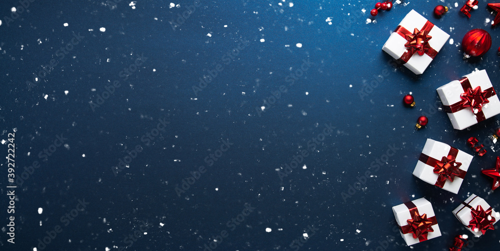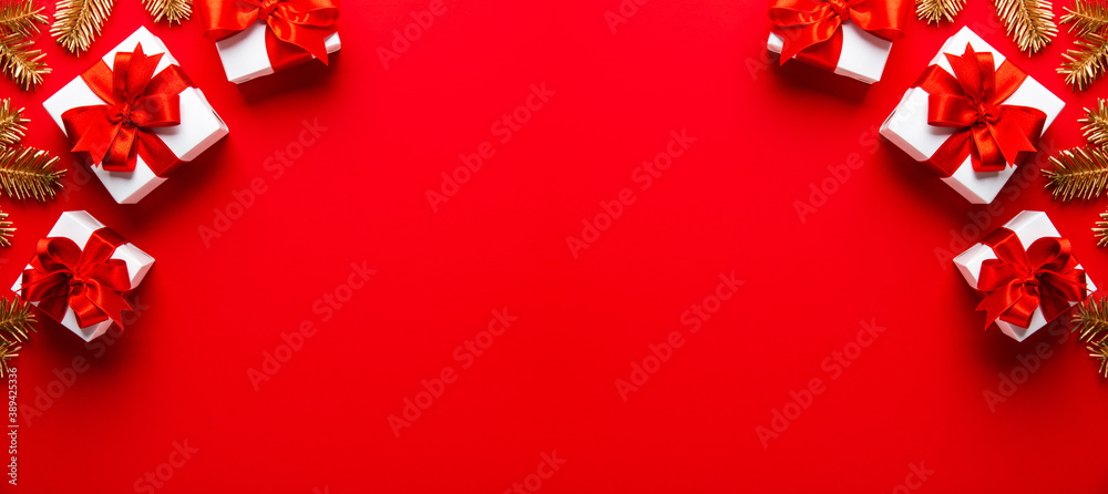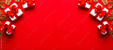Merry Christmas and Happy Holidays greeting card, frame, banner. New Year. Noel. Christmas ornaments and gift on red background top view. Winter xmas holiday theme. Flat lay