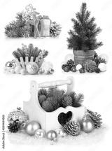 Collage mix set of gold deer with branch firtree and gift isolated on white background.
