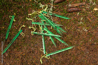 An abstraction of many pegs for a tourist tent. Pegs for a tourist tent.