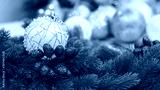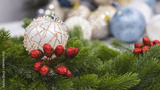 Christmas ball close-up, blurred bokeh background. Christmas background for a postcard. Decoration for a Christmas tree, spruce branches, New Year's ball.