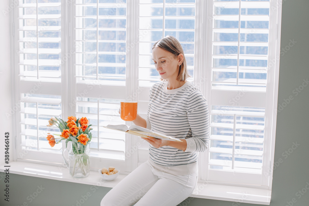 Beautiful happy middle age woman sitting on windowsill at home and reading book. Young woman with short hair drinking tea coffee from cup and holding reading book. Relax, leisure time at home.