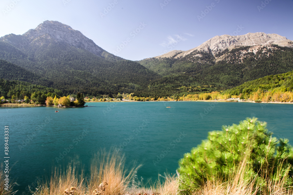 Beautiful lake Doxa and mountain Zireia in Peloponnese, Greece