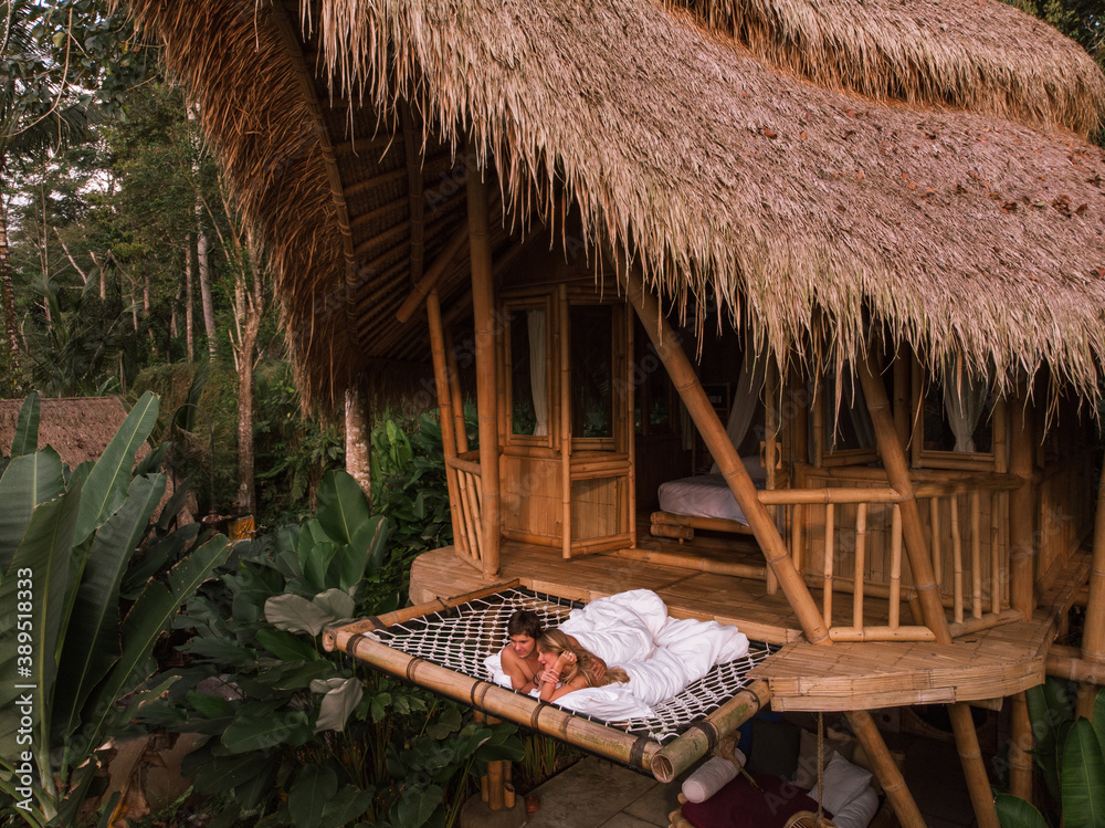 Young caucasian travel couple lie on hammock in bamboo eco house, nature and mountains on background. Couple wake up in outdoor jungle bed