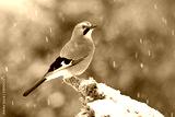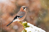 Eurasian jay, garrulus glandarius, sitting on bough in winter nature during snowfall. Brown bird with turquoise wings observing on moss bough. Small feathered animal watching on mossy twig.
