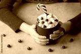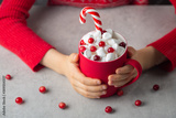 Girls’ hands holding a cup of beverage decorated with marshmallow and cranberries. Christmas time. Grey table.