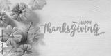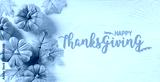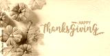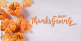 Thanksgiving background decoration from dry leaves and pumpkin on wooden background. Flat lay, top view with Thanksgiving text.