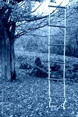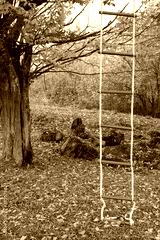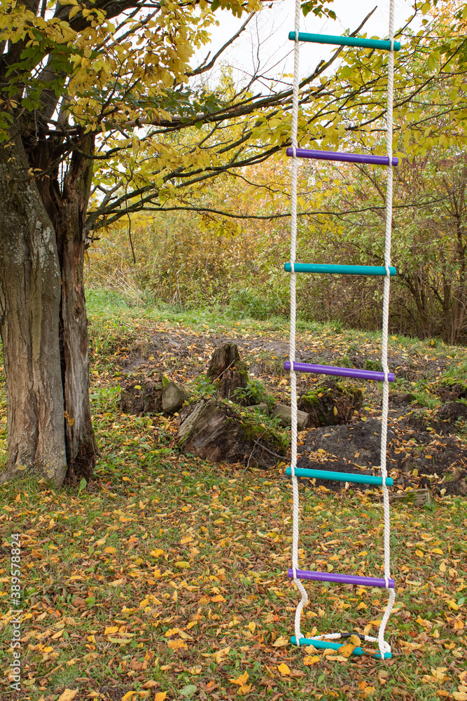 Hanging ladder mint and purple on the background of a large tree with a crown of yellow and green leaves