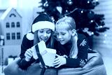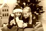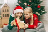 Two happy and beautiful teenage girls in New Year's outfits open gifts at home under the Christmas tree. Christmas mood. Concept for New Years holiday at home.