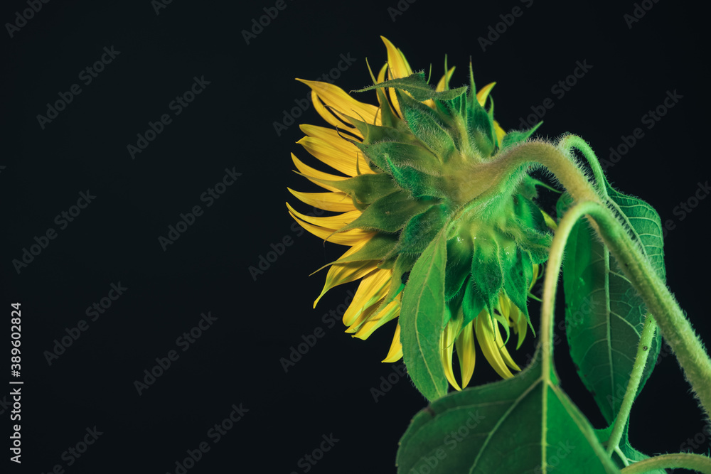 Sunflower plant on a black. View from back. Beautiful plant minimal. Minimalism retro style concept. Background pattern for design.