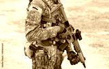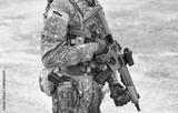 Soldier with assault rifle and flag of Brunei on military uniform. Collage.