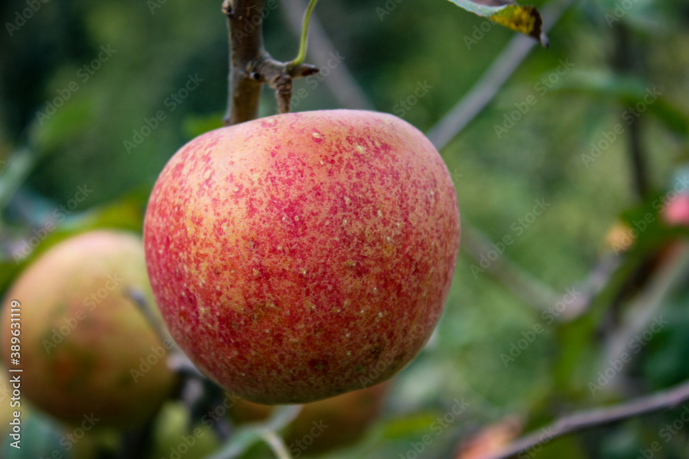 A beautiful slightly reddish apple on a branch in an orchard. Jonagold.