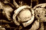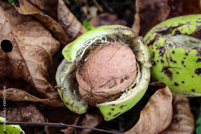 Harvesting in the home garden, ripe walnut. Ripe walnut on tree - autumn background.