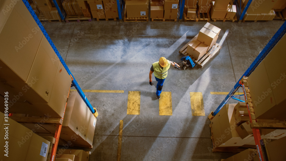 Top-Down View: Worker Moves Cardboard Boxes using Manual Pallet Truck, Walking between Rows of Shelves with Goods in Retail Warehouse. People Work in Product Distribution Logistics Center
