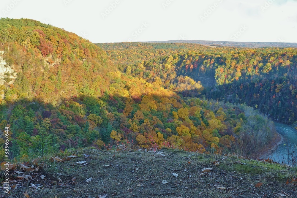 View of the Genesee River in Letchworth State Park in Castile, New York, during foliage season in autumn