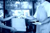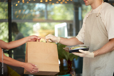 pleasant waiter man give orders in package to female customer, good service of restaurant staff. coronavirus, covid-19, epidemic outbreak, quarantine. waiter in protective gloves