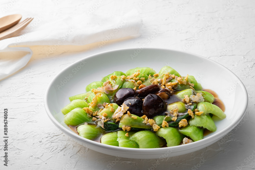 Baby Bok choy or chinese cabbage in oyster sauce with Shitake Mushrooms and fried garlic.