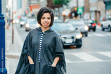 Beautiful Latin young woman in grey stylish poncho with fringe in urban street. Fashion and street style. Pretty hispanic brunette woman with short hair bob pixie. Millennial in a city.