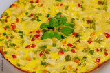 Omelet with chives, bell pepper and cauliflower. Close up.