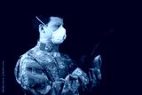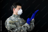 American soldier wearing a protective mask puts on medical gloves. The man is dressed in an American military uniform. The US military help in the fight against KOVID-19. Protection from coronavirus.