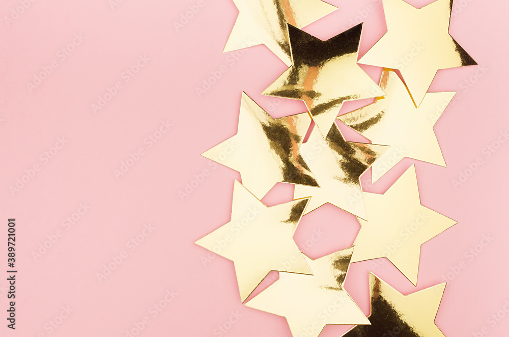 Luxury glamour gold stars on soft light pastel pink festive background, flat lay, border.