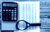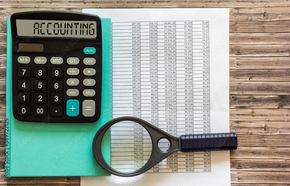 Accounting, text on calculator, near a magnifying glass, documents with numbers and a notebook on a wooden table