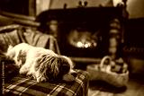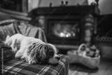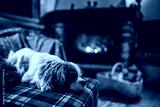 Cute Little Puppy Resting By The Fireplace at Home. Cavalier King Charles Spaniel baby dog sleeping, sitting, taking a nap by the cozy burning fireside in Swiss mountain chalet. Festive Cristmas