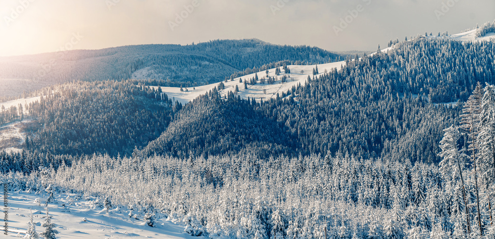 Beautiful view at winter mountains landscape with fir trees covered by snow. Vivid white spruces on a snowy day. Alpine ski resort. Winter greeting card. Happy New Year, toning