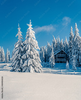 Beautiful snowy fir trees in frozen mountains landscape with house on north. Christmas background with tall spruce trees covered with snow. Alpine ski resort. Winter greeting card. Happy New Year