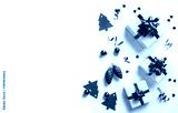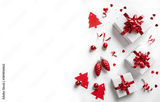 Merry Christmas card made of Christmas gift boxes with red bows, decoration, sparkles and confetti on white background. Xmas and New Year holiday banner with bokeh, light, glitter. Flat lay, top view