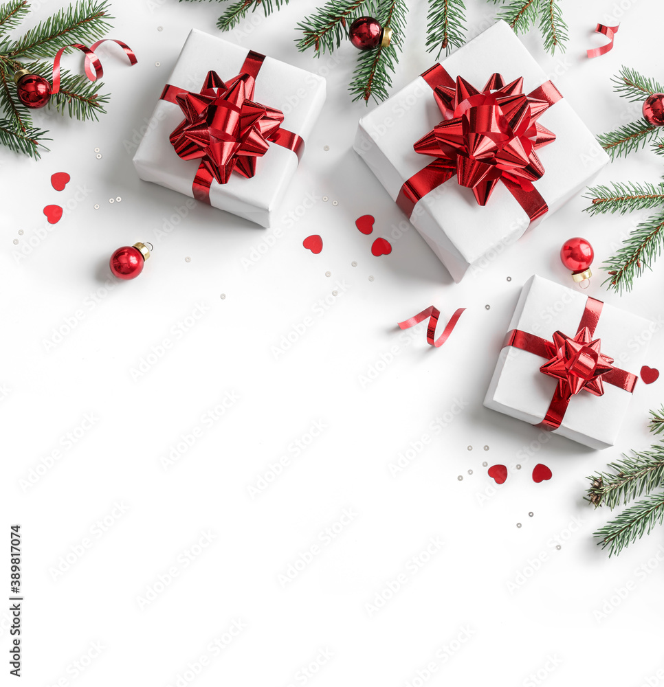 Merry Christmas card made of Christmas gift boxes with red bows, silver decoration, fir branches, sparkles and confetti on white background. Xmas and New Year holiday banner. Flat lay, top view