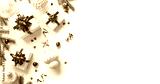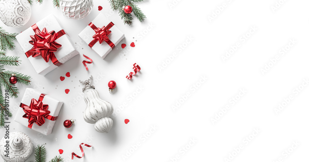 Merry Christmas card made of Christmas gift boxes with red bows, silver decoration, fir branches, sparkles and confetti on white background. Xmas and New Year holiday banner. Flat lay, top view