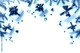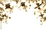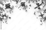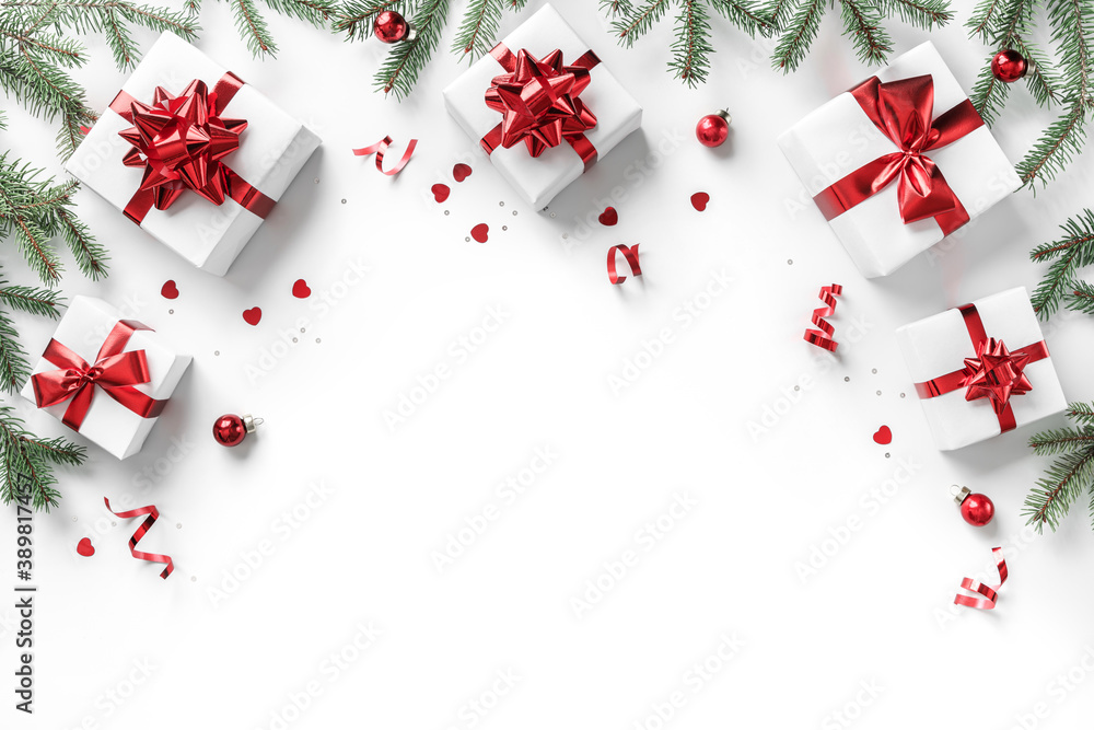 Creative frame made of Christmas fir branches, gift boxes, red decoration, sparkles and confetti on white background. Xmas and New Year holiday, bokeh, light. Flat lay, top view