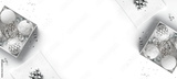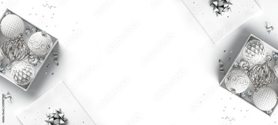 Merry Christmas card made of gift box, white and silver decorations, sparkles and confetti on white background. Xmas and New Year holiday banner, bokeh, light. Flat lay, top view
