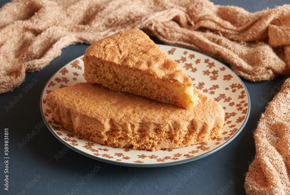Delicious freshly baked sponge cake on a plate