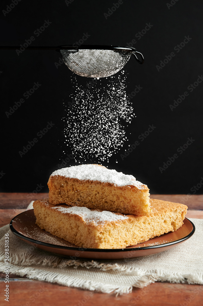 Delicious freshly baked sponge cake, sprinkling icing sugar